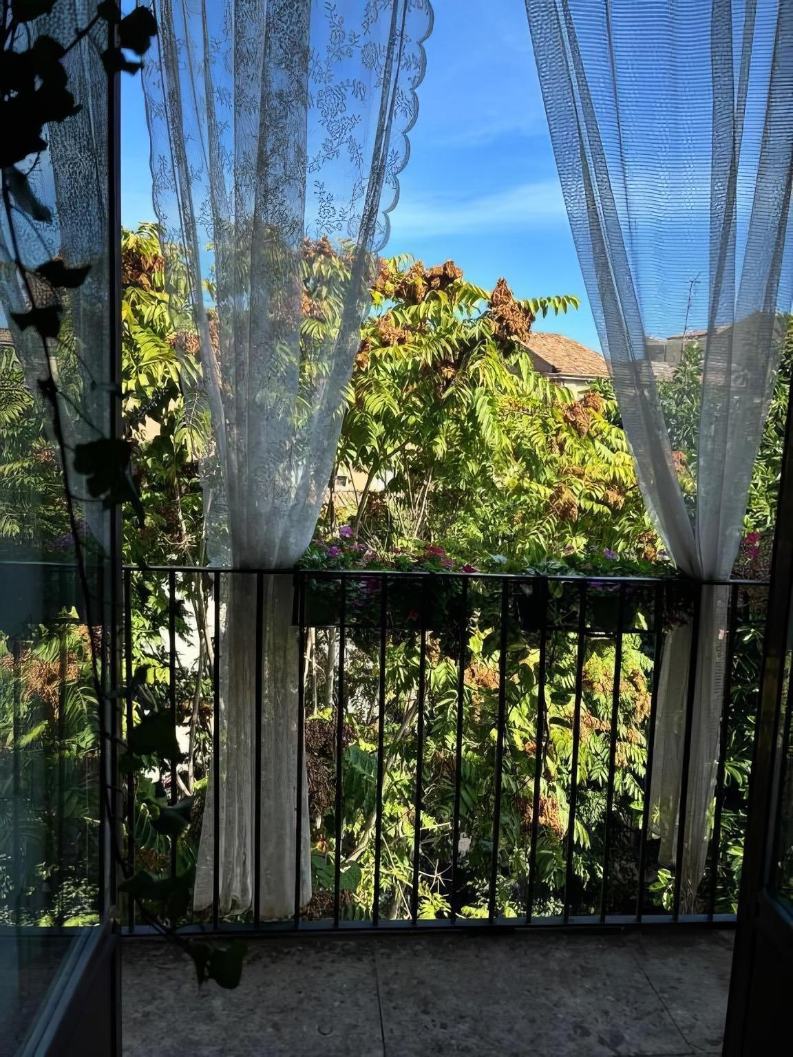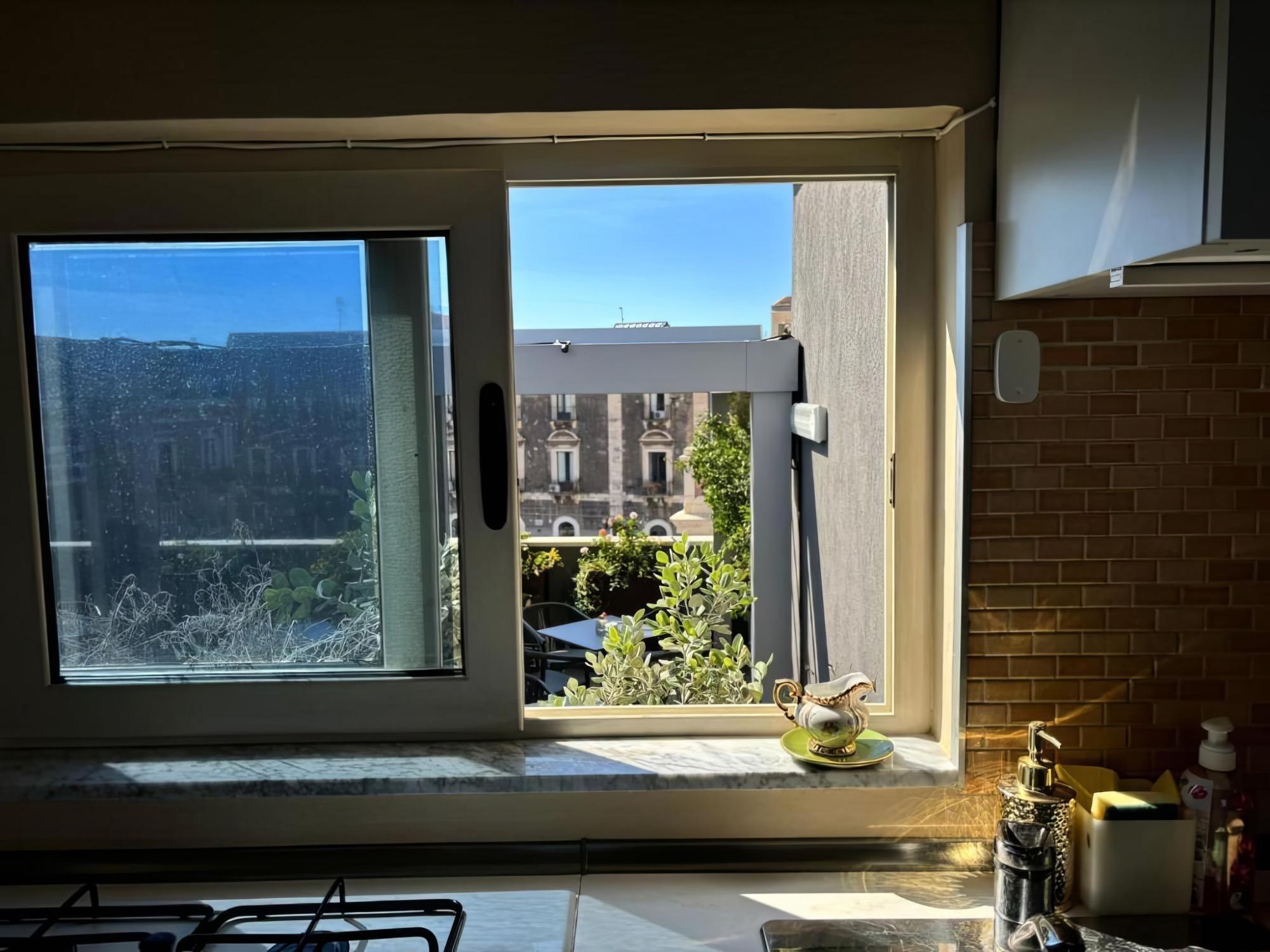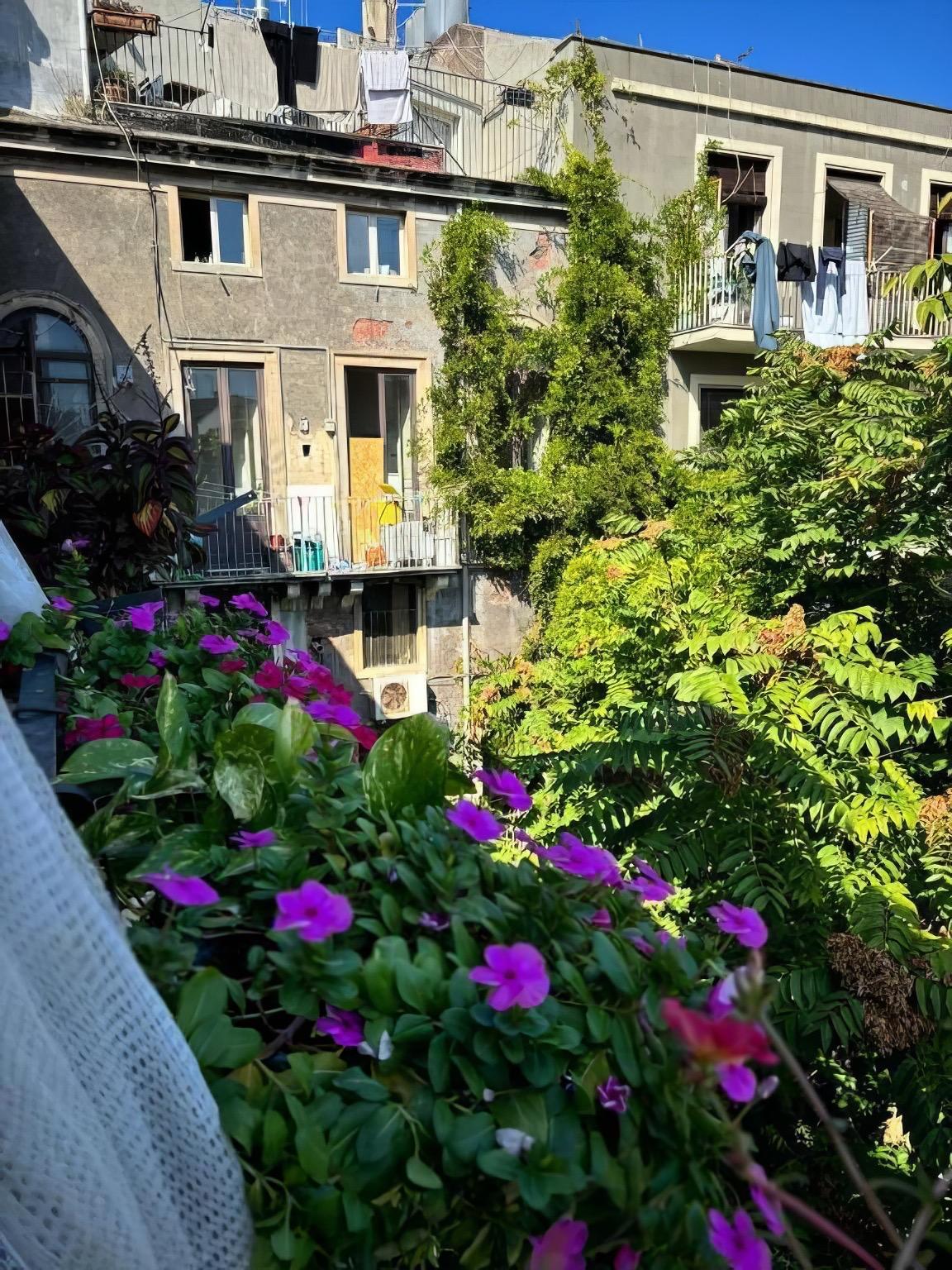 Affacciata sulla suggestiva Piazza Cardinale Pappalardo, recentemente ristrutturata e ora completamente pedonale, la casa gode di una posizione privilegiata di fronte al Palazzo Biscari, uno dei capolavori del barocco catanese. Il balcone interno regala invece uno scorcio tranquillo sul cortile condominiale, ombreggiato da grandi alberi.